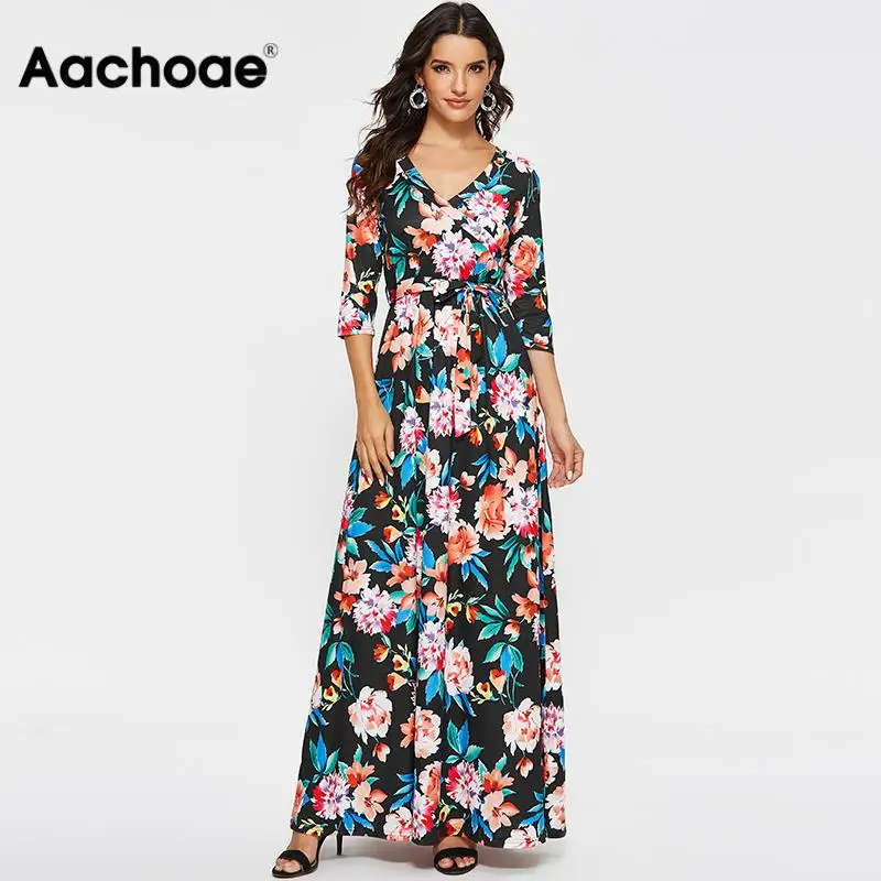 Женское Элегантное Длинное платье 2019, сексуальное, с v-образным вырезом, с принтом, Boho, стильные платья с рукавом средней длины, Платье макси ...