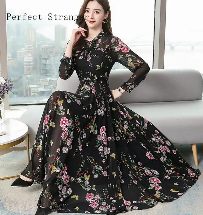 Весна 2020, Новое поступление, высокое качество, плюс размер, S-4XL, богемное, стоячий воротник, цветочный принт, женское шифоновое длинное платье