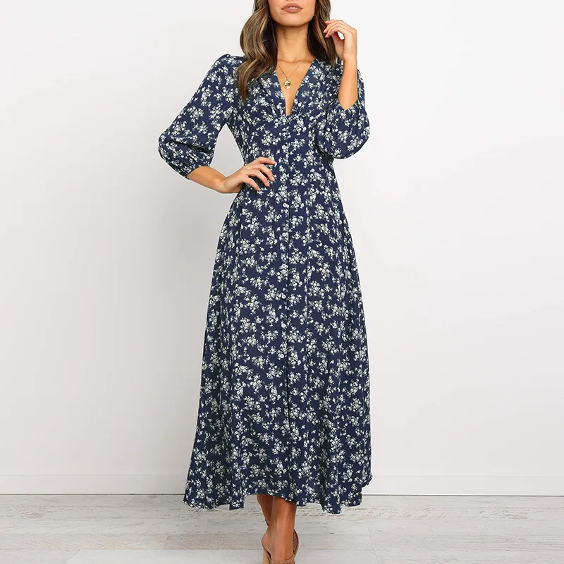 Neploe Весна Милые платья для девочек тонкая талия Vestido 2019 Цветочный принт длинный шикарный v-образным вырезом Однобортный длинное, свободное ...