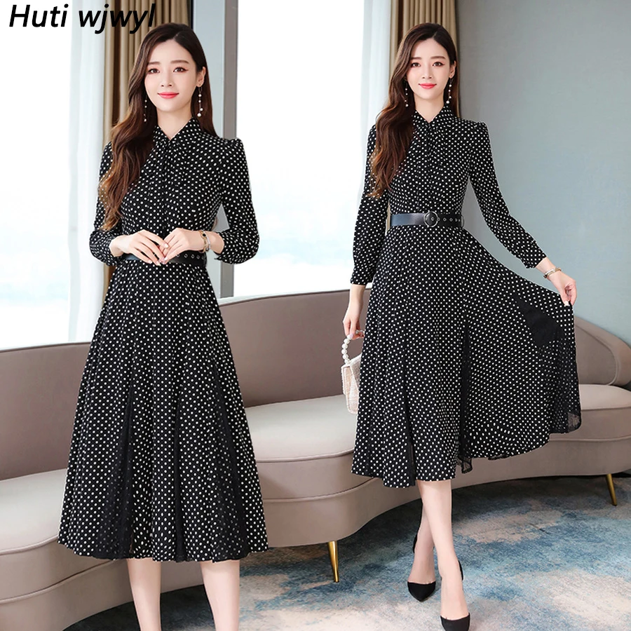 2019 женское винтажное платье миди в черный горошек Boho Осень Зима Новое Кружевное сексуальное платье с длинными рукавами элегантные женские ...