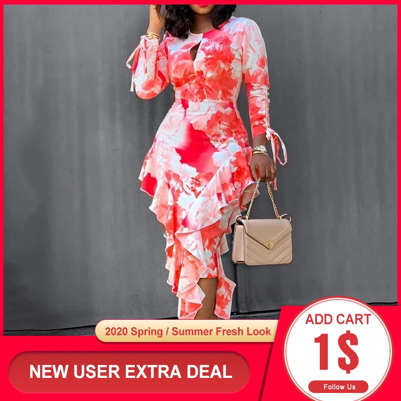Falbala платье с круглым вырезом для шеи, платье Boho цветочное печатное платье тонкий 2020 весенние пикантные туфли с вырезами и оборками платья Для женщин вечерние офисные миди платье Vestidos XXL