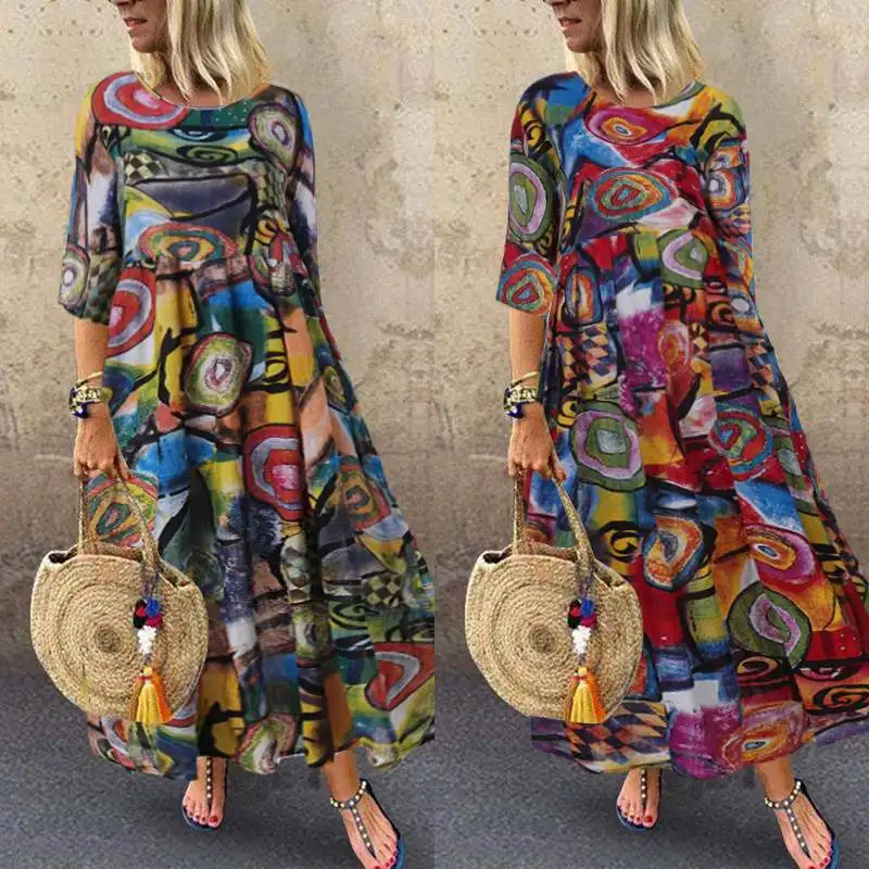 Женский сарафан с принтом, ZANZEA 2020, Элегантное летнее макси платье, повседневное, рукав 3/4, туника, Vestidos, женское плиссированное платье размера плюс