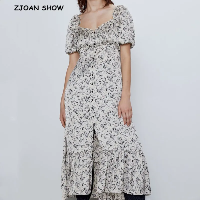 2020 французское маленькое платье с цветочным принтом и коротким рукавом для женщин с квадратным воротником и оборками, однобортные платья на пуговицах Vestido