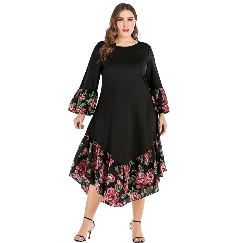 Siskakia, платья размера плюс, милое цветочное лоскутное асимметричное платье миди с подолом, Элегантное расклешенное платье с круглым вырезом и длинным рукавом, весна 2020, новинка 4XL