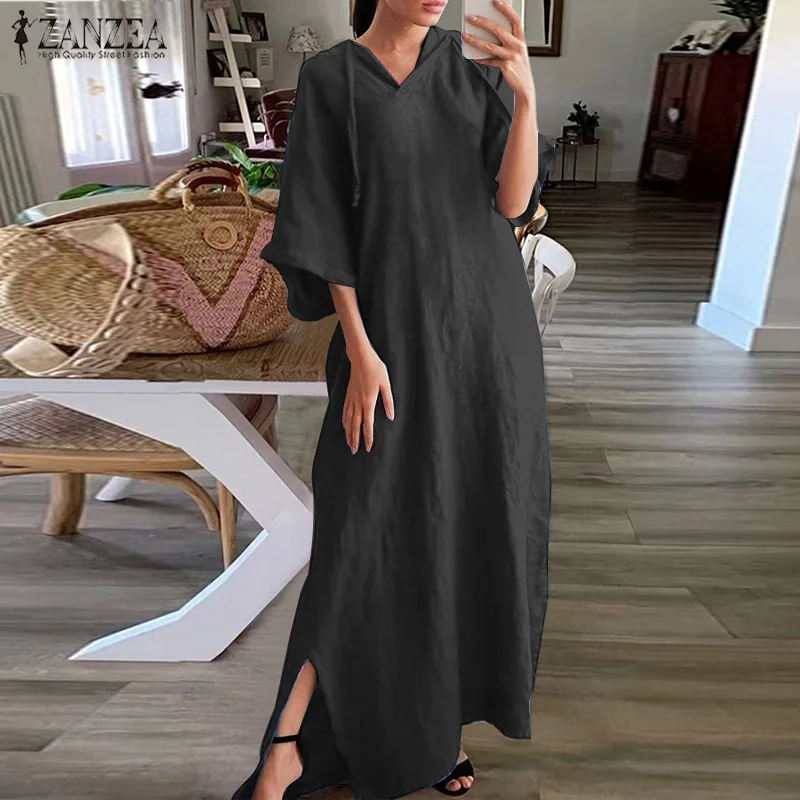 ZANZEA 2019 Повседневное платье с капюшоном негабаритных женщин Хлопок Твердые Карманы платья модные длинные макси Vestidos Летний Пляжный Сарафан