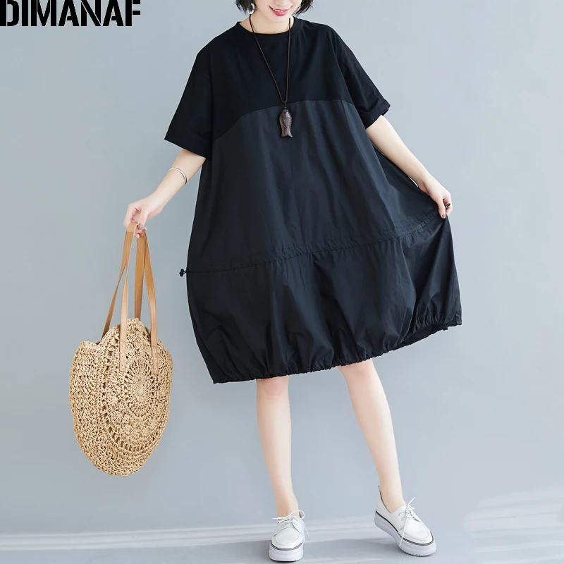 DIMANAF женское платье большого размера на лето и весну, хлопковое женское платье Vestidos, свободная плиссированная одежда, повседневное комбинированное платье, однотонный черный сарафан