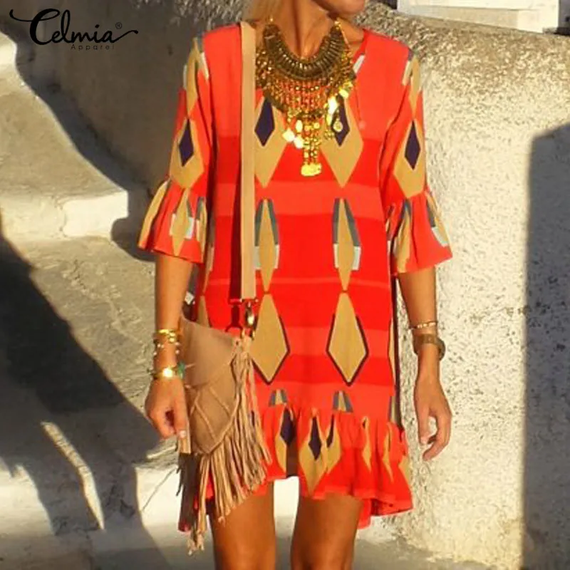 Женское платье в богемном стиле Celmia, повседневное свободное мини-сарафан с коротким рукавом и оборками, винтажный принт, большие размеры 5XL, лето 2020