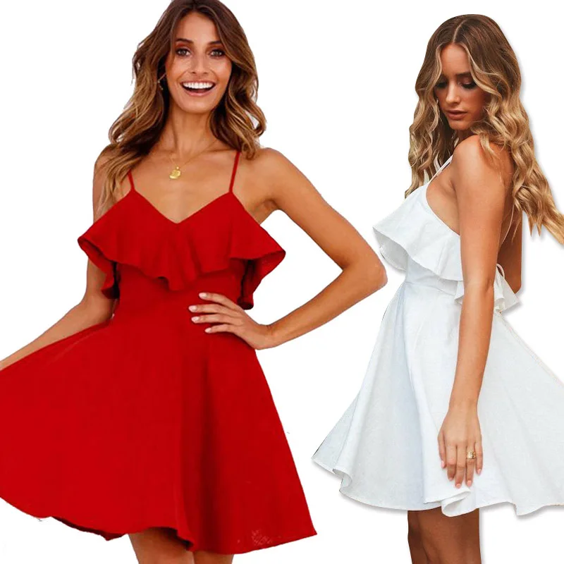 Для женщин летний сарафан 2019 соблазнительное Клубное с вырезом на спине платье на тонких бретельках с оборками облегающие мини-платья с v-об...