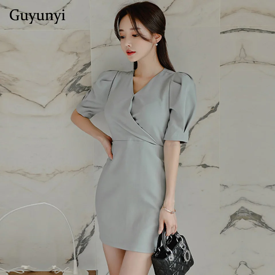 Простое офисное женское платье 2020, летнее модное платье с пышными рукавами, v-образным вырезом и высокой талией, простые элегантные вечерние женские платья