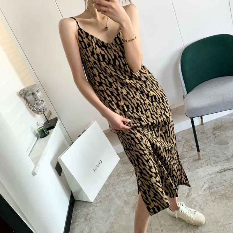 Винтажное сексуальное леопардовое платье без рукавов с v-образным вырезом женское длинное платье с разрезом 2020 модное летнее платье