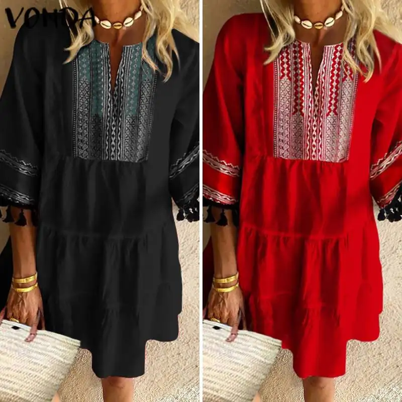 VONDA, женское платье, 2020, сексуальное, v-образный вырез, половина рукава, с кисточками, мини платья, свободный, с принтом, пляжный сарафан, 5XL, лет...