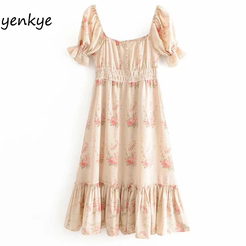 Элегантное женское милое длинное платье с цветочным принтом, женское платье с квадратным вырезом, с коротким рукавом, с эластичной талией, Т...