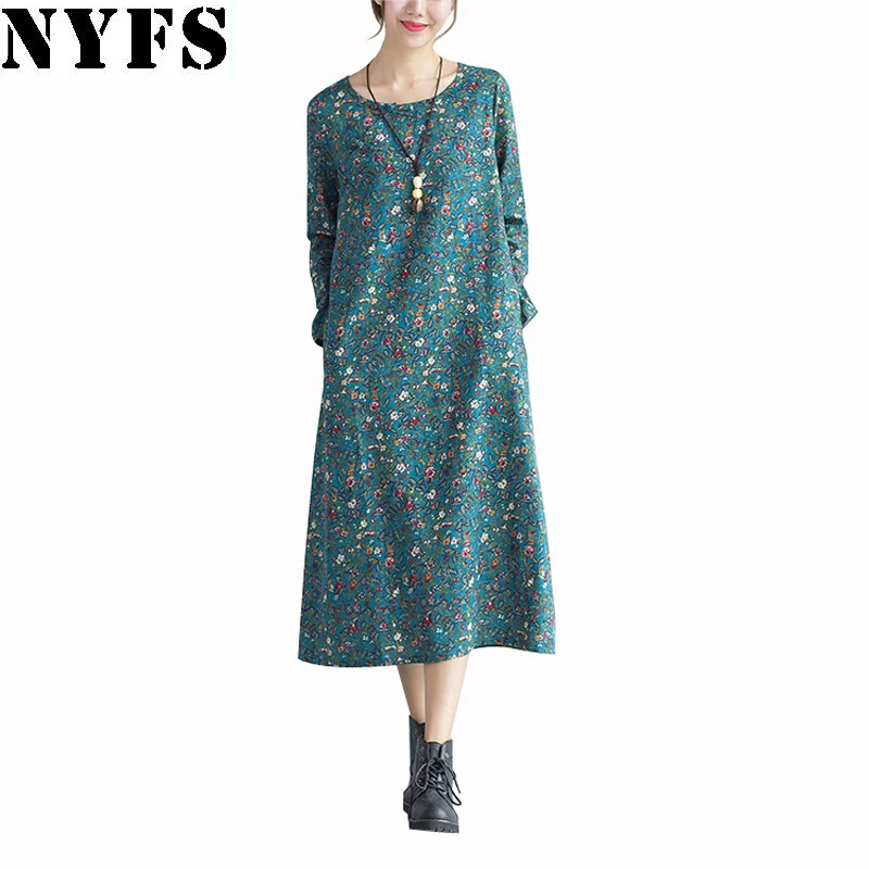 NYFS 2019 Демисезонный с длинным рукавом женское платье большого размера, Винтаж Цветочный свободные хлопковые длинное льняное платье vestidos Elbise