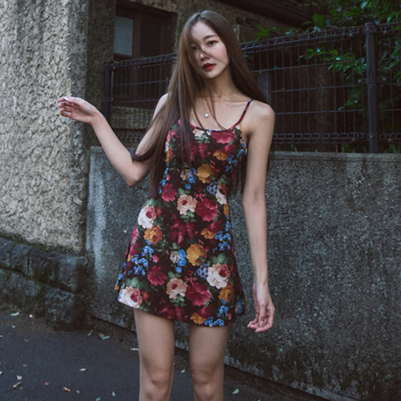 Harajuku Flower Print Camisole Woman Retro High-Rise Loose A-Line Dress Ladies Nordic Slim Summer Mini Ladies Dresses 2020