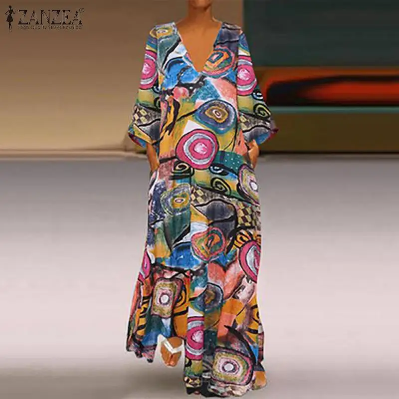 ZANZEA 2019 осеннее цветочное длинное платье с принтом женское с v-образным вырезом 3/4 рукав сарафан винтажные вечерние Макси Vestido Robe Femme свободно...
