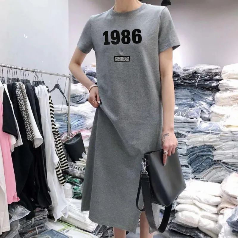 2019 летнее платье с принтом цифр, с разрезом по бокам, модное повседневное женское платье с круглым вырезом и коротким рукавом