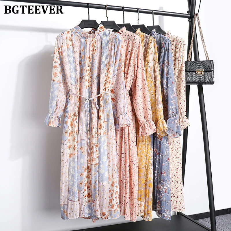 BGTEEVER Весна Лето шифоновое платье для женщин с длинным рукавом на шнуровке цветочный принт свободное женское плиссированное платье 2020 миди ...