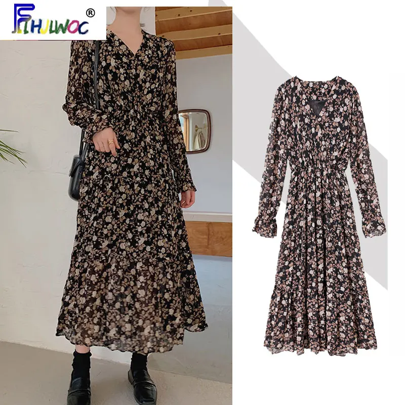 Женское платье с цветочным принтом, винтажное длинное платье с длинным рукавом и оборками, с эластичной резинкой на талии, с v-образным вырезом, в Корейском стиле 214
