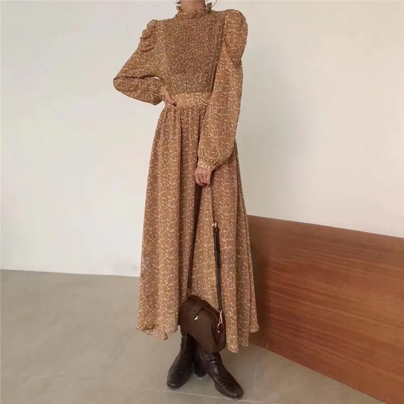Винтажное осеннее ретро платье женское свободное 3/4 рукав круглый вырез длинное платье хлопок цветочный принт элегантное облегающее плать...