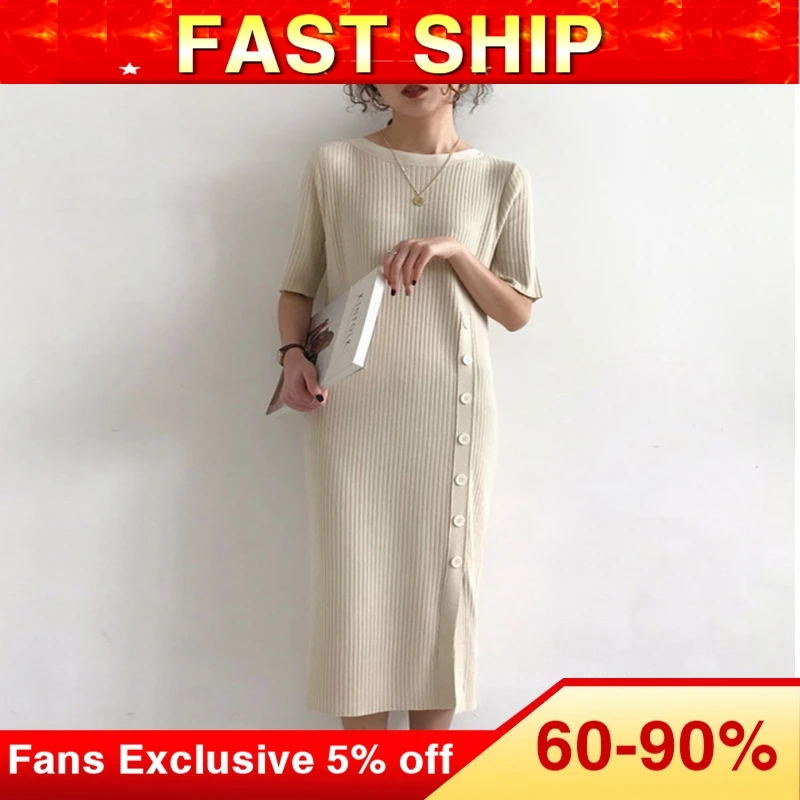 Летнее корейское вязаное платье-свитер, женское элегантное однотонное бежевое приталенное платье с рукавом до локтя, Ретро стиль, элегантный дизайн, минимализм