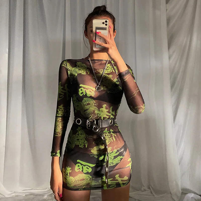 Сексуальное просвечивающее мини-платье с принтом, женское Повседневное платье с длинными рукавами и круглым вырезом, весна-лето 2020, облегаю...