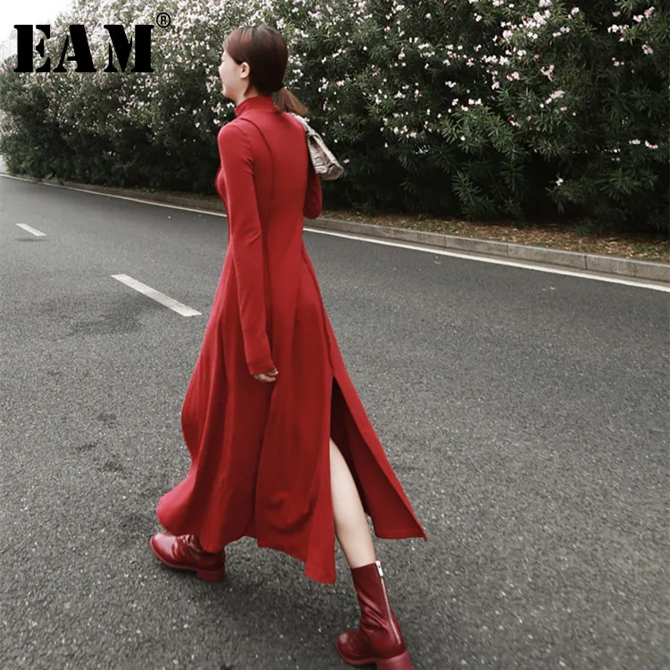 [EAM] 2019 новый пружинная подставка воротник с длинным рукавом черный подол Vent Looe нерегулярные линии разделение платье для женщин мода прилив ...