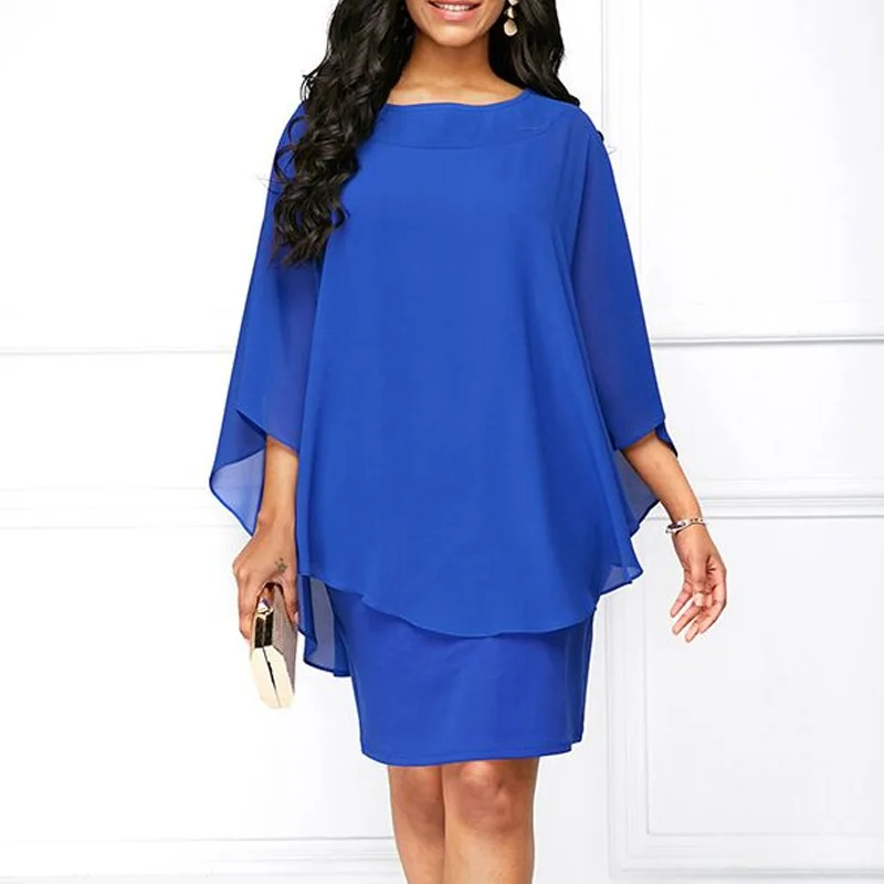 Плюс Размеры 3XL 5XL Для женщин два Слои шифоновое платье свободного кроя 2019 Лето O шеи с оборками мода синий пляжный костюм Бохо мини-платье бо...