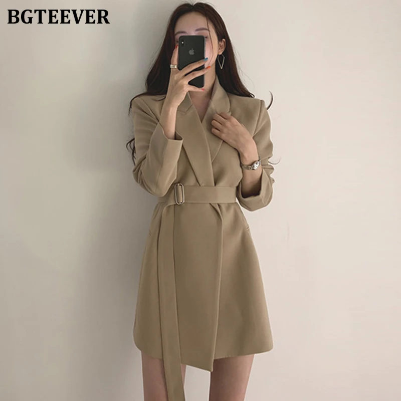 BGTEEVER OL Стиль Осень Зима Зубчатый воротник пояса женское платье полный рукав тонкая талия женское платье трапециевидной формы костюм платье...