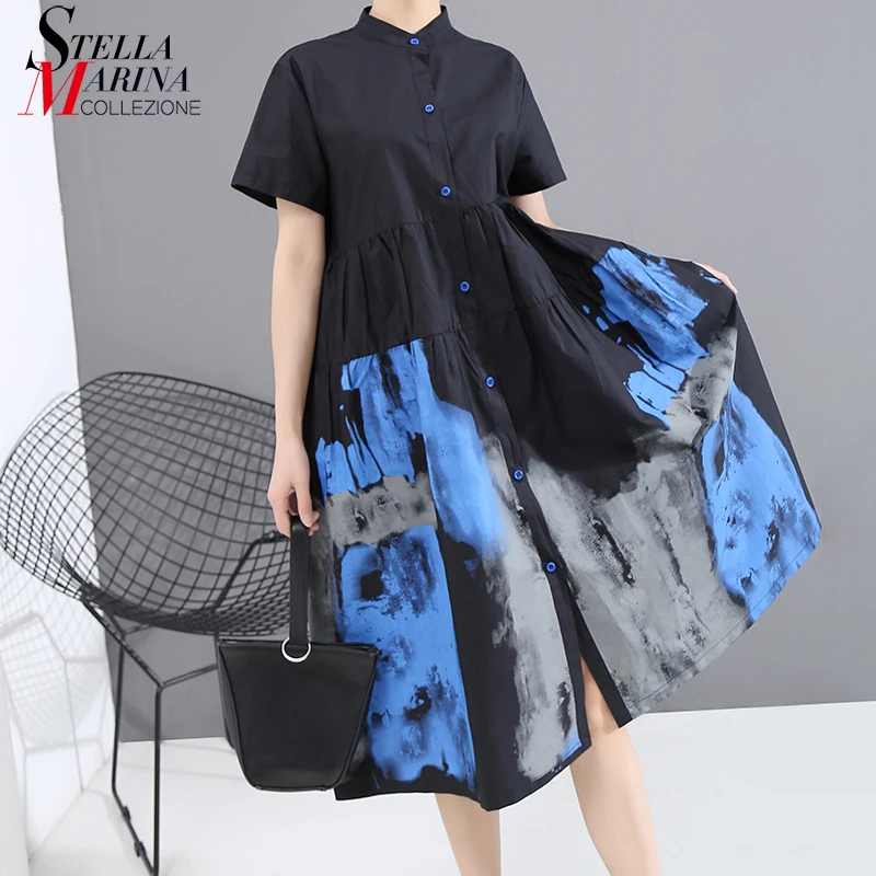* Новинка 2020, корейский стиль, женское летнее черное платье-рубашка, с рисунком, с принтом, для девушек, повседневное, уличная одежда, миди платье, женское платье 6125