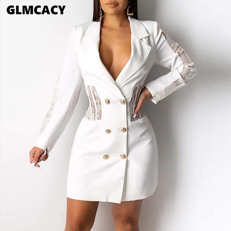 Женское двубортное платье-блейзер с зубчатыми лацканами, кружевная вставка, длинный рукав, Elegnat, осенняя рабочая одежда, зимние мини-платья