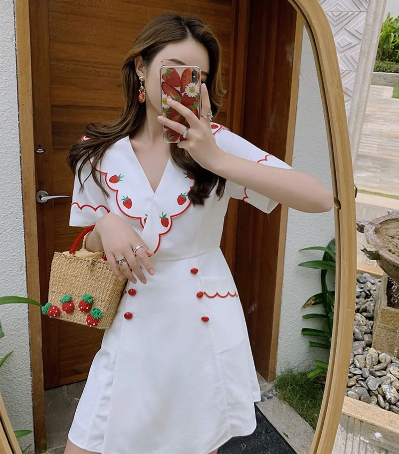 Элегантное женское двубортное платье с v-образным вырезом и вышивкой клубники, с коротким рукавом и карманом, лето 2020, женские милые белые комбинезоны