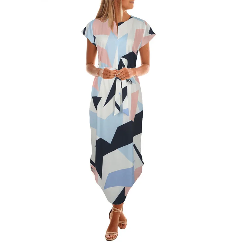 S-3XL плюс Размеры сарафан короткий рукав платье с геометрическим принтом 2018 Sexy V шеи Несимметричное длинное платье Для женщин Летнее пляжное ...