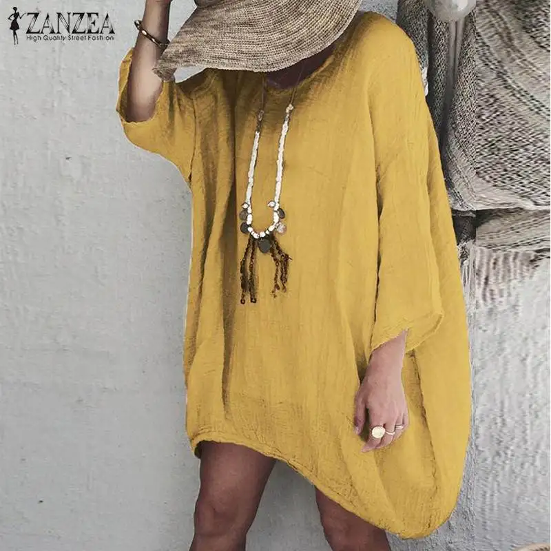 Летние топы женские Мини-туника, платье 2019 ZANZEA кафтан 3/4 рукав Сандерс Твердые мешковатые Vestidos женские длинные рубашки работы Blusas