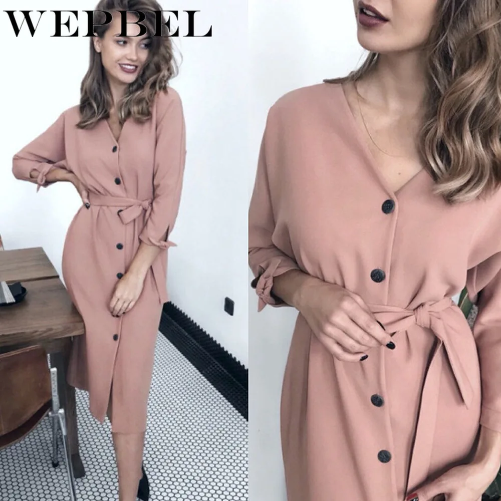 Женское винтажное платье WEPBEL, повседневное офисное платье с v-образным вырезом, длинным рукавом и пуговицами