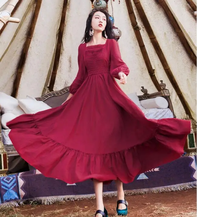 Высокое качество Лидер продаж Рождество День Мода квадратный воротник узорчатый сплошной цвет женские длинные вечерние платья Красный