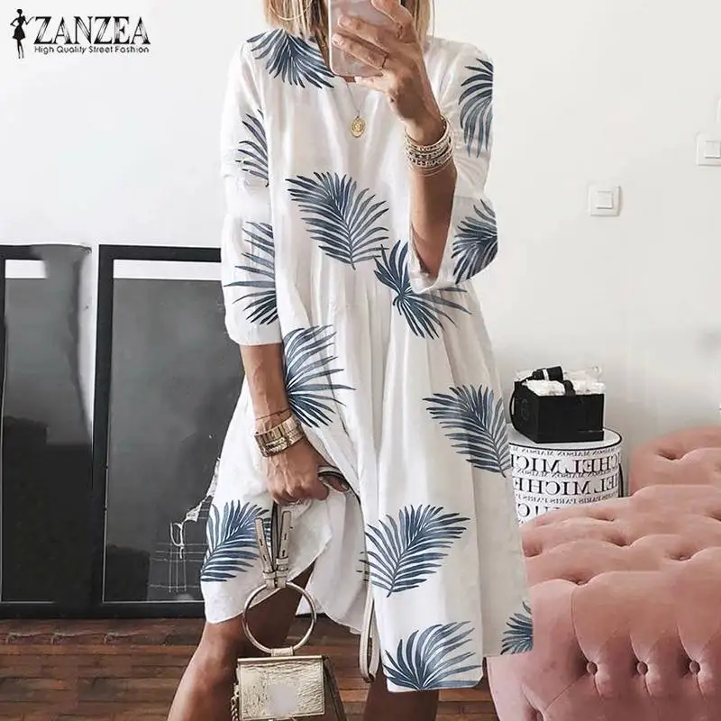 Плюс размер 2019 платье ZANZEA женское осень лето Зима Vestidos 3/4 рукав печатные платья Пляжная Дамская рубашка-миди кафтан