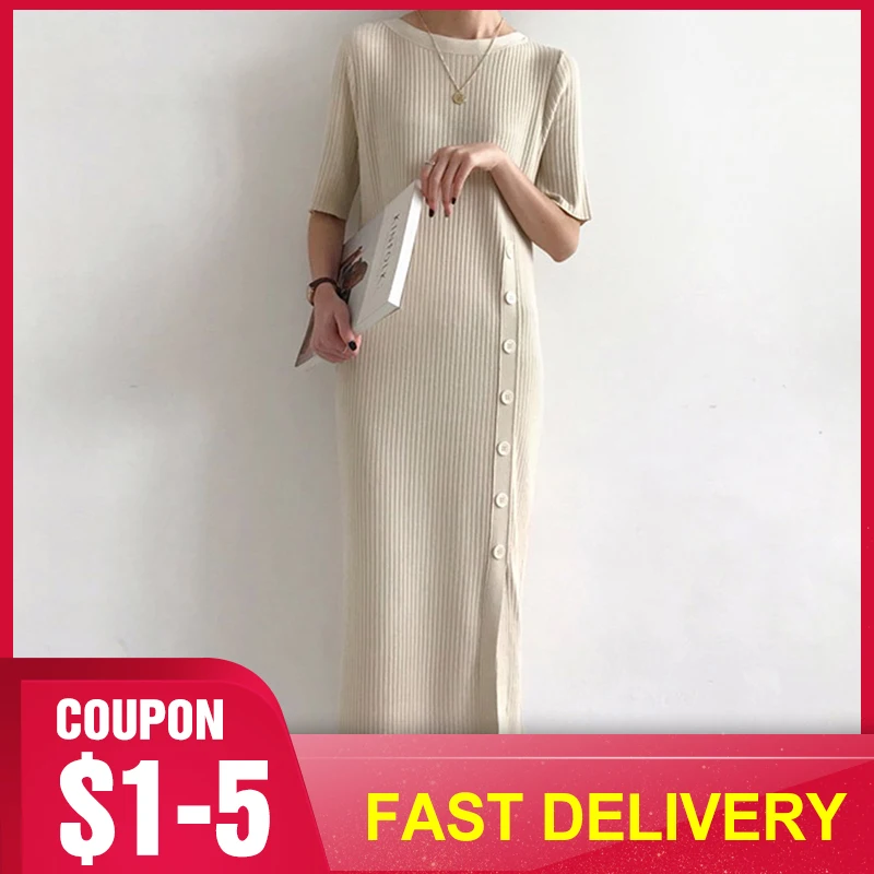 Летнее корейское вязаное платье-свитер, женское элегантное однотонное бежевое приталенное платье с рукавом до локтя, Ретро стиль, элегантный дизайн, минимализм
