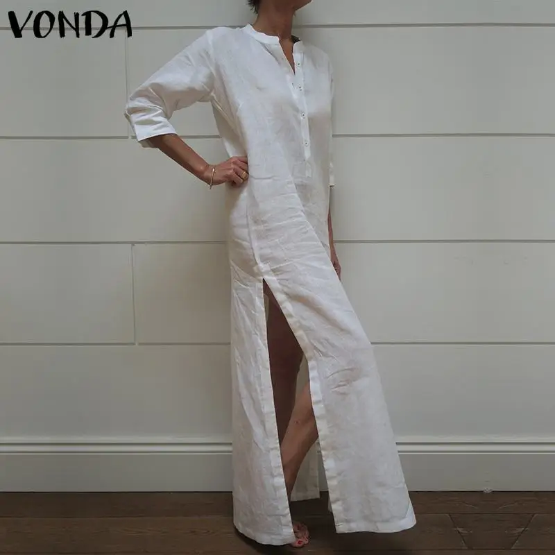 VONDA Для женщин платье-рубашка 2019 осенние пикантные пуговицах с v-образным вырезом Разделение низ Твердые Макси Длинные вечерние платья повс...
