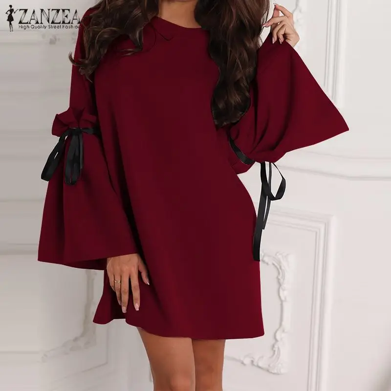 2019 ZANZEA летний однотонный галстук-бабочка вечерние мини-платья женские повседневные длинные расклешенные рукава Свободный сарафан элегант...