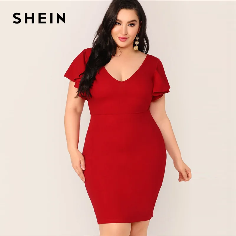 Шеин размера плюс, Красное Облегающее платье с молнией на спине и рюшами, 2019, женское летнее элегантное облегающее платье-карандаш с рукавом...
