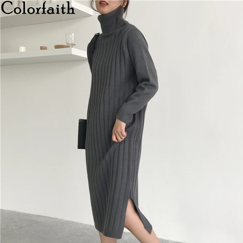 Colorfaith, новинка 2019, Осень-зима, женские платья, водолазка, с разрезом, трикотажные, плотные, прямые, повседневные, миди, женские платья, DR829