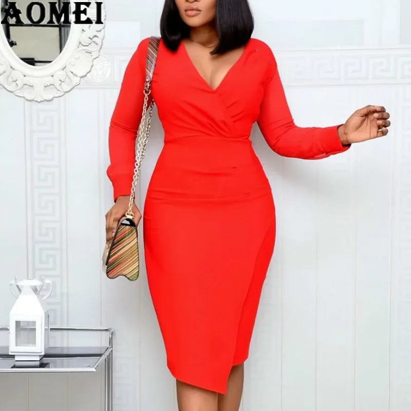 Женское облегающее платье с длинным рукавом и v-образным вырезом, облегающее элегантное облегающее платье большого размера, эластичное весеннее модное платье, новинка 2020
