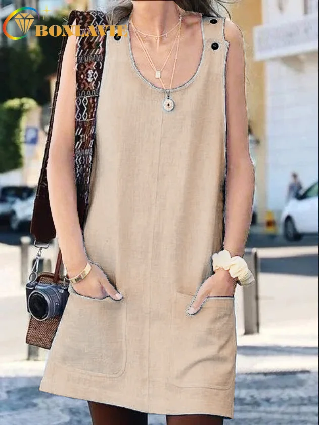 Летнее женское платье с карманами и пуговицами, платье без рукавов, длиной до колена, с круглым вырезом, с естественной талией, многоцветное,...