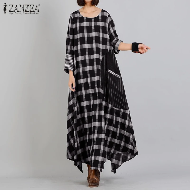 Винтажное платье в клетку, женский сарафан в клетку, ZANZEA, весна, повседневное, длинный рукав, макси, Vestidos, женский полосатый халат, женский, плюс размер, 7