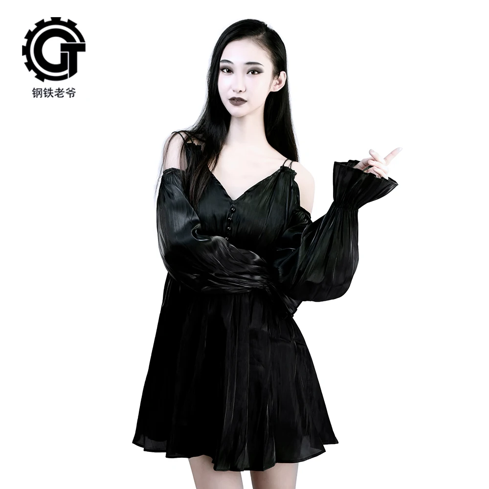 Темное холодное ветро ремень маленькое черное свободное кружевное платье было тонким и сексуальным темпераментом корт ветер ремень платье