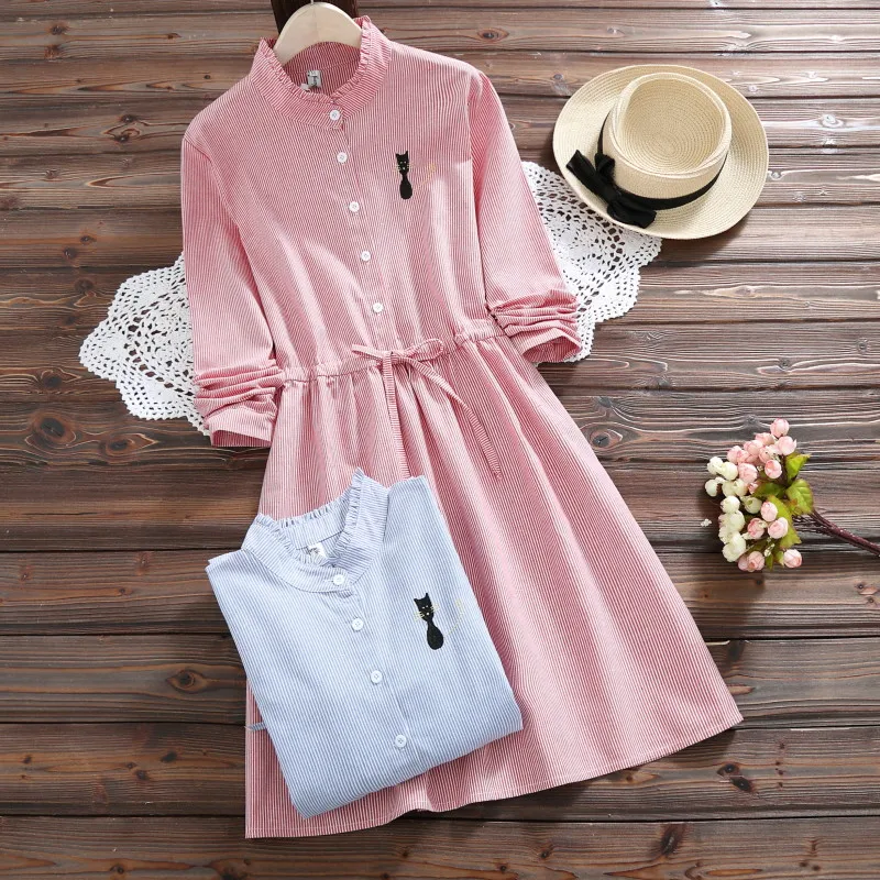 Новинка 2018 года, модное женское платье в полоску с вышивкой в виде кота, платье средней длины с воротником-стойкой, приталенное платье с элас...