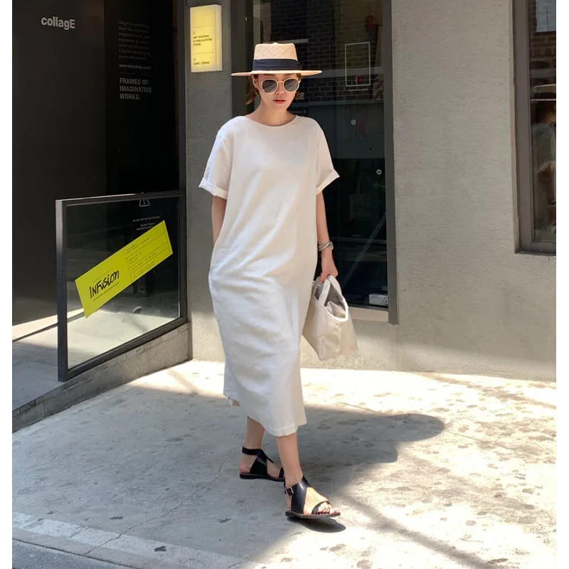 Женские летние платья из хлопка и льна, свободное однотонное длинное платье свободного покроя, простая Женская одежда, 2020