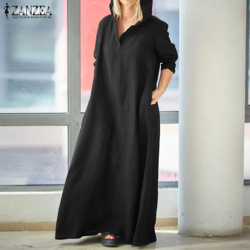 ZANZEA 2019 осень с капюшоном платье макси Для женщин толстовки с длинным рукавом из хлопка и льна платье Винтаж Повседневное Vestido халат большого...