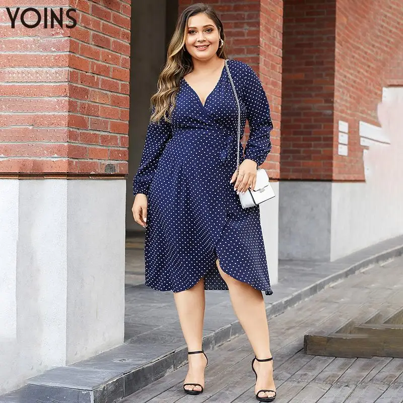 YOINS богемное платье с поясом и v-образным вырезом, в горошек, с оборками, с разрезом, с длинным рукавом, платье миди, 2019, винтажные женские плат...