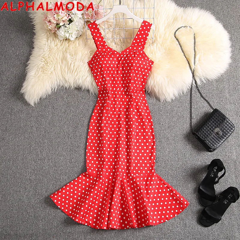 Женское облегающее платье ALPHALMODA, летнее красивое облегающее платье в горошек с подкладкой, платье на бретелях